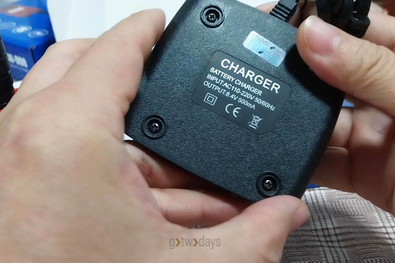 แท่นชาร์จ แบบทั่วไป 3ขั้ว ตรงรุ่น ตรงขั้วแบตเตอรี่ ไฟเข้า(input) ใช้ไฟบ้าน กระแสสลับ AC 110-220 V. 50/60Hz ไฟออก (output) 8.4 V. 500 mA สายไฟยาวประมาณ 85 cm. ติดกับฐานแท่นชาร์จไม่สามารถถอดออกได้และใต้ฐานของแท่นชาร์จไม่มีบุ่มยางปิครูสกรู แต่วางไว้ได้ไม่มีเลื่อน