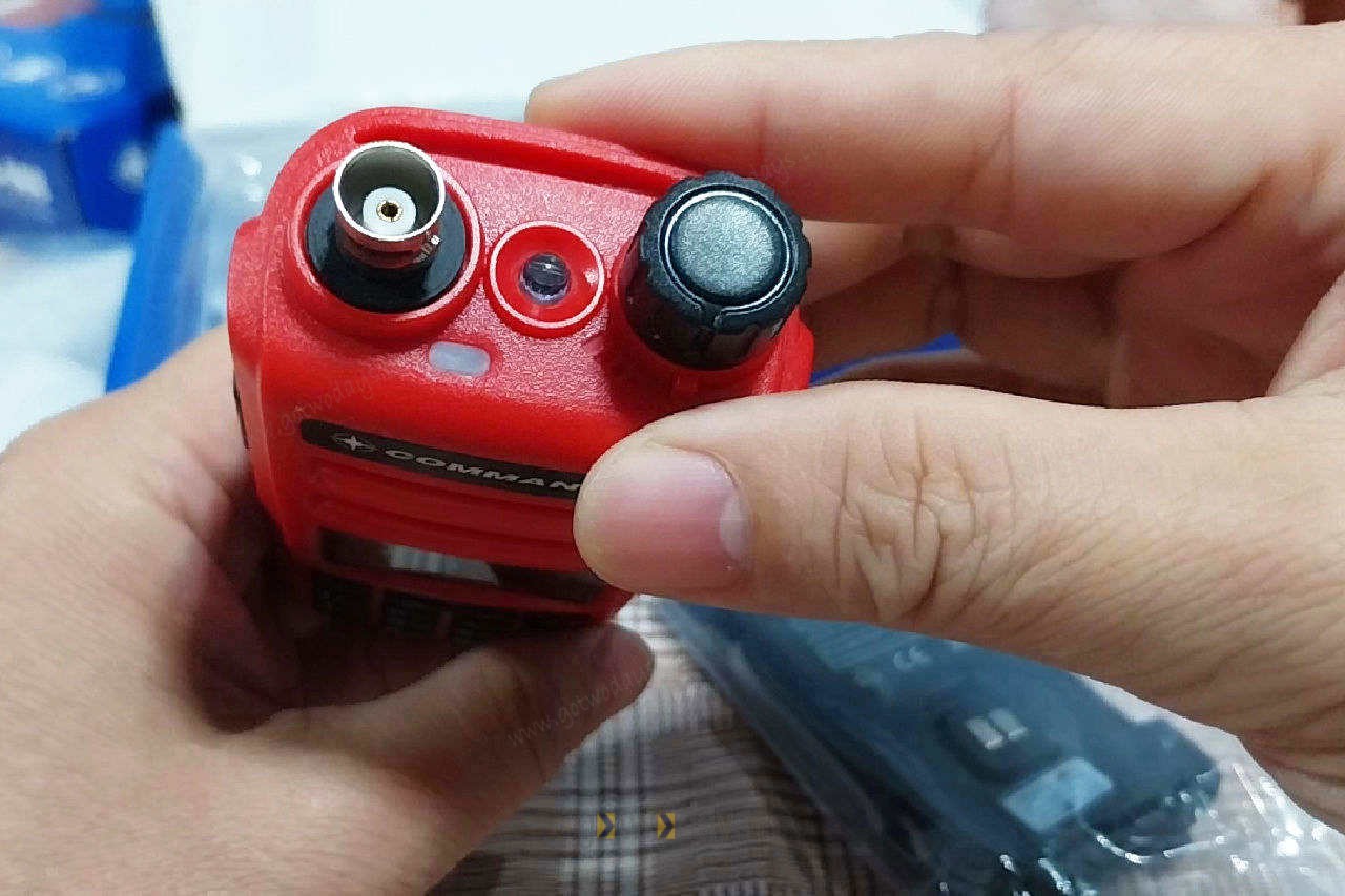 ด้านบนมีไฟ LED สำหรับใช้เป็นไฟฉายส่องสว่าง ปุ่มกดด้านข้างมี 3ปุ่ม ปุ่มบนสุดใช้เป็นปุ่ม เปิด – ปิด ไฟ LED ปุ่มใหญ่ตรงกลางเป็นปุ่ม PTT และปุ่มด้านล่าง เป็นปุ่มเสควล อีกด้านเป็นช่องเสียบชุดไมค์ – หูฟัง ที่น่าจะใช้กับชุดหูฟังที่ผลิตสำหรับเครื่องจีนทั่วไปได้