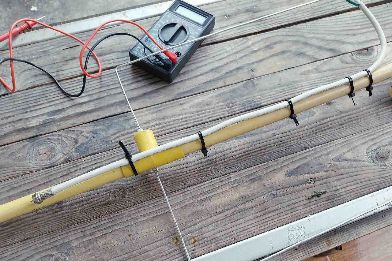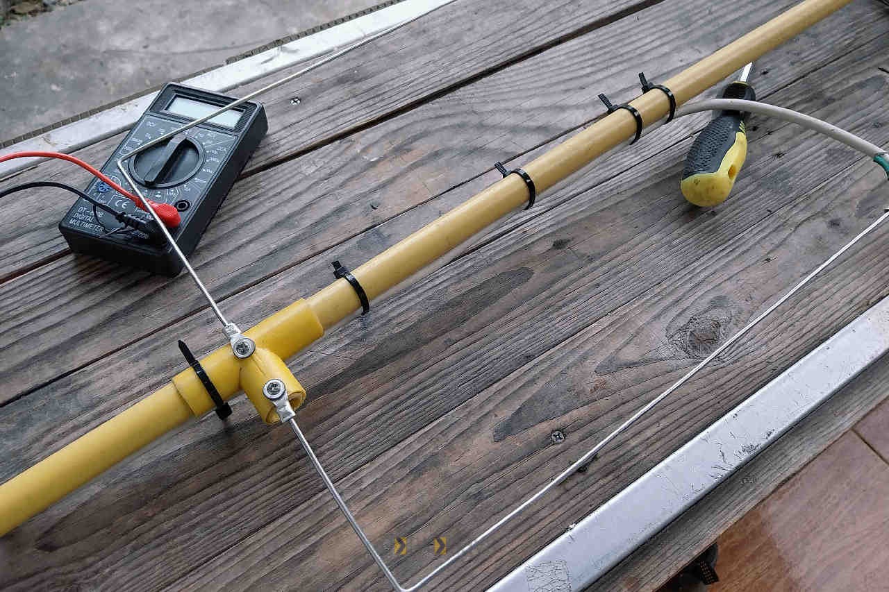 เตรียมแผ่นพลาสติกหรือแผ่นไม้ขนาดประมาณ 2×4 cm. เจาะรูนำทั้งสองฝั่งห่างกัน~3 cm. เพื่อเป็นจุดป้อนสัญญาณ ประกอบลวดทั้งสามเส้นเข้ากับโครงสร้างหลักและแผ่นพลาสติก ยึดสายนำสัญญาณเข้ากับแผ่นพลาสติกที่เตรียมไว้