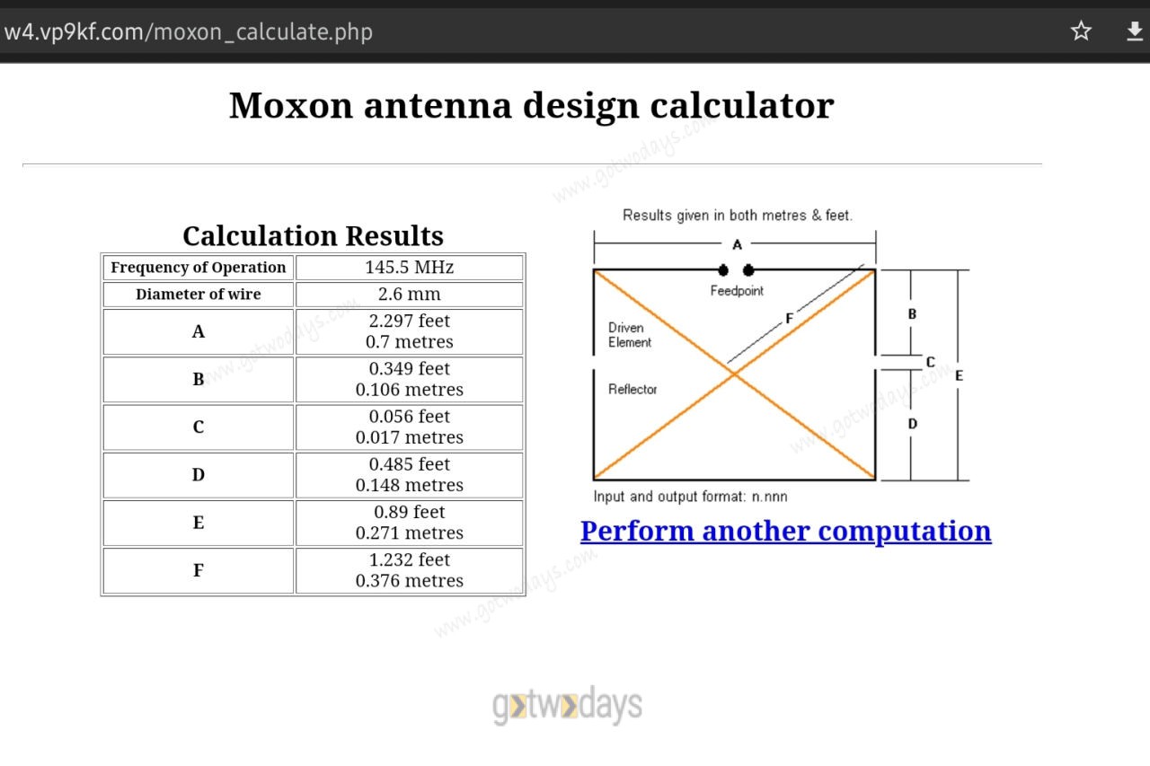 แต่ที่ทำจริงใช้ขนาดสัดส่วนที่คำนวณจากเว็บไซต์นี้ https://w4.vp9kf.com/moxon_design.htm โดยใส่ขนาดเส้นผ่านศูนย์กลางของเส้นลวด คือเท่ากับ 2.6 mm. กับใช้ความถี่ที่ต้องการ อันนี้ใช้ความถี่ ย่าน 2 m. ตรงกลางของช่วงความถี่ที่ กสทช. อนุญาตให้ใช้ 144.00-147.000 MHz หรือ 145.5 MHz แล้วกดคำนวณ