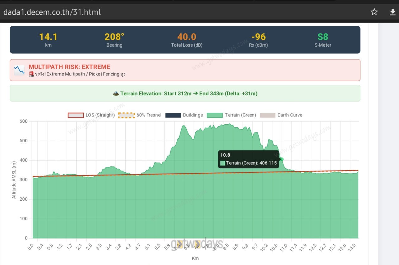 สำเร็จแล้ว! มาทดสอบประสิทธิภาพกัน ต่อด้วยสาย RG58 ยาว 5m. ขั้วBNC ต่อเข้าเครื่องวัด SWR SX-400 ป้อนสัญญาณเข้าจากเครื่องส่ง Handy 5W. ได้ค่า VSWR ประมาณไม่เกิน 1.1:1.0 โดยที่ไม่ต้องปรับอะไรเพิ่มเติม ตั้งเสา Portable สูง 4 m. ทดสอบการออกอากาศกับเพื่อนนักวิทยุสมัครเล่น E25XXZ ห่างกัน ประมาณ 14 กิโลเมตร มีภูเขาและอุปสรรคตามธรรมชาติ (ภาพจำลองด้านล่าง) รับสัญญาณจาก E25XXZได้ ORK4 S-meter ของเครื่อง Handy เต็มสเกล ส่วนภาคส่งนั้น E25XXZ รับได้ ORK1-2 ช่วงท้ายคีย์ของการสนทนา สัญญาณเฟดลง ไปแน่ใจว่าเกิดจากเหตุใด ไว้ทดลอง QSO หาจุดบกพร่องกันต่อไป หลังจากนั้นได้ standby ฟังเพื่อนนักวิทยุคุยกัน แล้ววางพิกัดที่พอรู้ ระยะห่างมากสุดที่รับได้ประมาณ 50 km. แต่ต้องหมุนด้านหน้า Driven element ไปในทิศทางของสถานีที่ส่งสัญญาณมา เพื่อช่วยให้รับสัญญาณได้ดีขึ้น