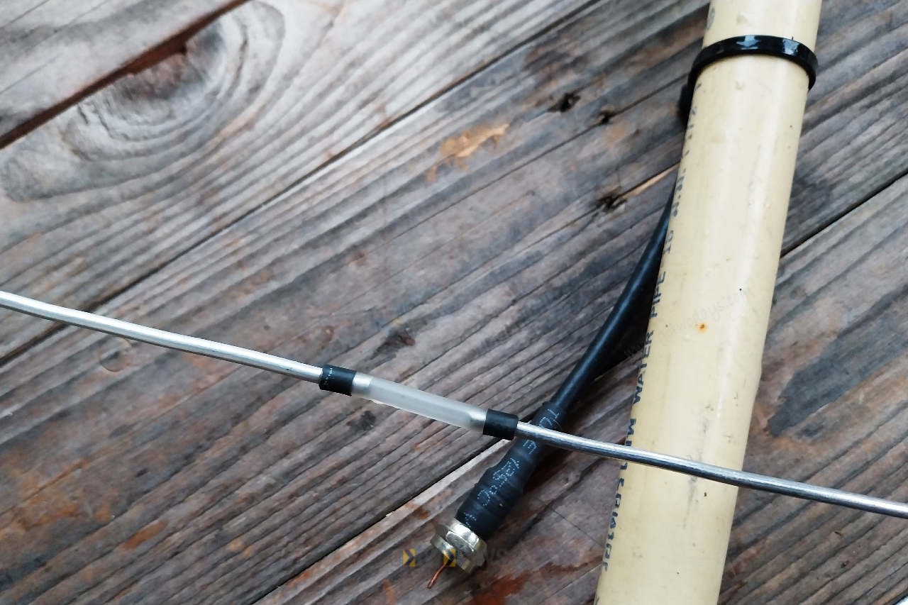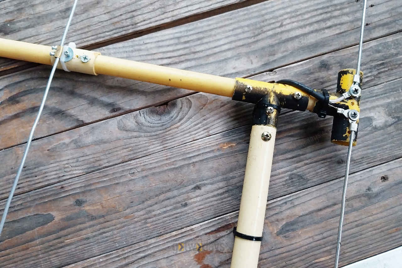 แล้ว.. ในความเป็นทฤษฎีมันก็มีความบังเอิญ เมื่อเราเลื่อนมือจับลวดในตำแหน่งที่เปลี่ยนไป เห็นจุดต่ำสุด SWR หน้าจอเครื่อง VNA เลื่อนไปมา คิดว่าวัสดุทุกอย่างที่สัมผัส หรืออยู่ใกล้ลวดมีผลต่อการกระจายคลื่น จึงออกแบบโครงสร้างใหม่เสากลางขึ้นครึ่งเดียว แยกซ้ายขวาด้วยท่อสามทาง ปลายด้านจุดป้อนสัญญาณใส่ท่อสามทางเช่นกัน ไว้ยึดขั้วสายนำสัญญาณ ส่วนปลายลวดทั้งสองใช้เป็นท่อยางเสียบพอพยุงไว้ ไม่ใส่ลึกเกิน ลองครอบยางลึกเกินไป ทำให้ ค่า SWR ต่ำลง โครงตรงกลางให้เลื่อนได้ เพื่อปรับระยะห่างปลายลวด B-D ให้ได้ค่าที่เหมาะสม